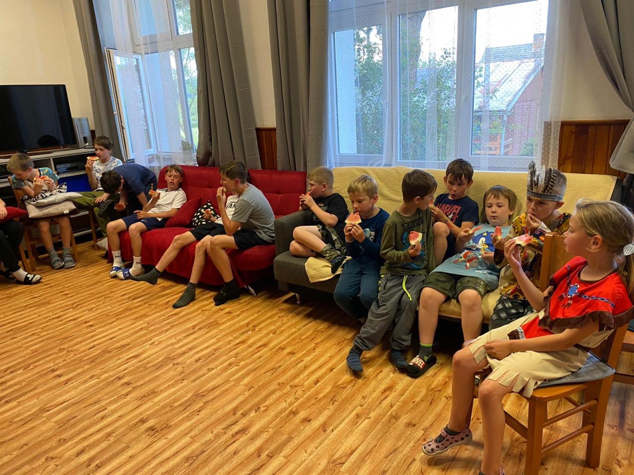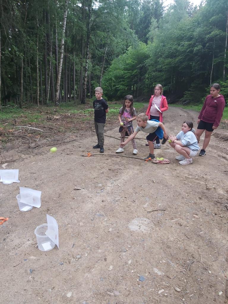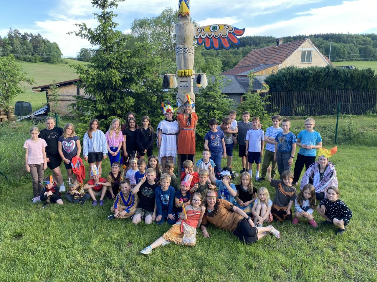 Čtvrteční dopoledne patřilo učení a krátké procházce po okolí. Odpoledne na děti čekala indiánská stezka. Týmy soutěžily, který z nich ji projde nejrychleji a který po cestě uloví nejvíce bizonů. Odpolední program jsme zakončili hrátkami na místním hřišti. Po večeři došlo na tak očekávaný karneval/diskotéku. Děti vytančily poslední zbytky energie, které v nich ještě po nabitém týdnu zůstaly. Všichni už se těší až zítra obejmou své maminky a tatínky. Pac a pusu, zítra u busu!