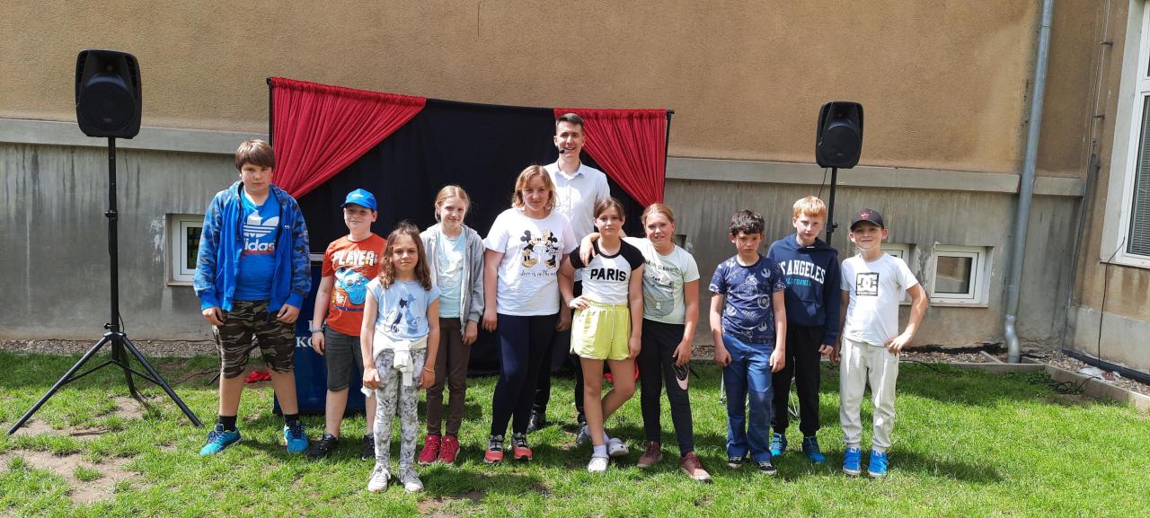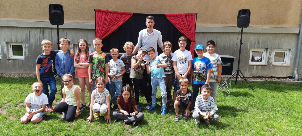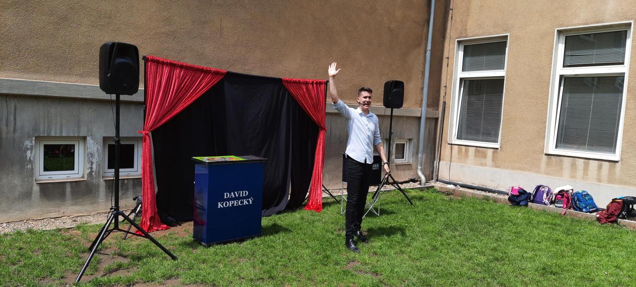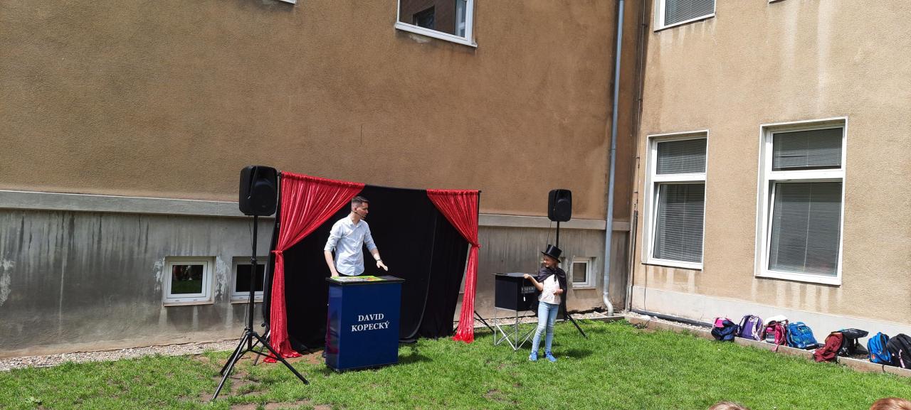 Den dětí si žáci užili v pátek 31.5.na školní zahradě s kouzelníkem Davidem.