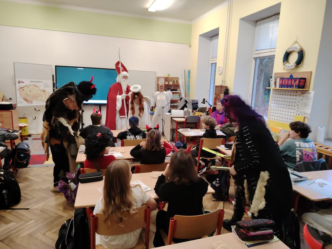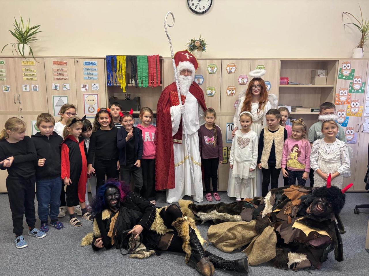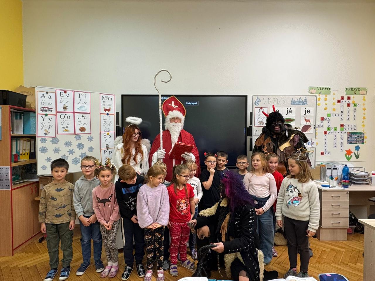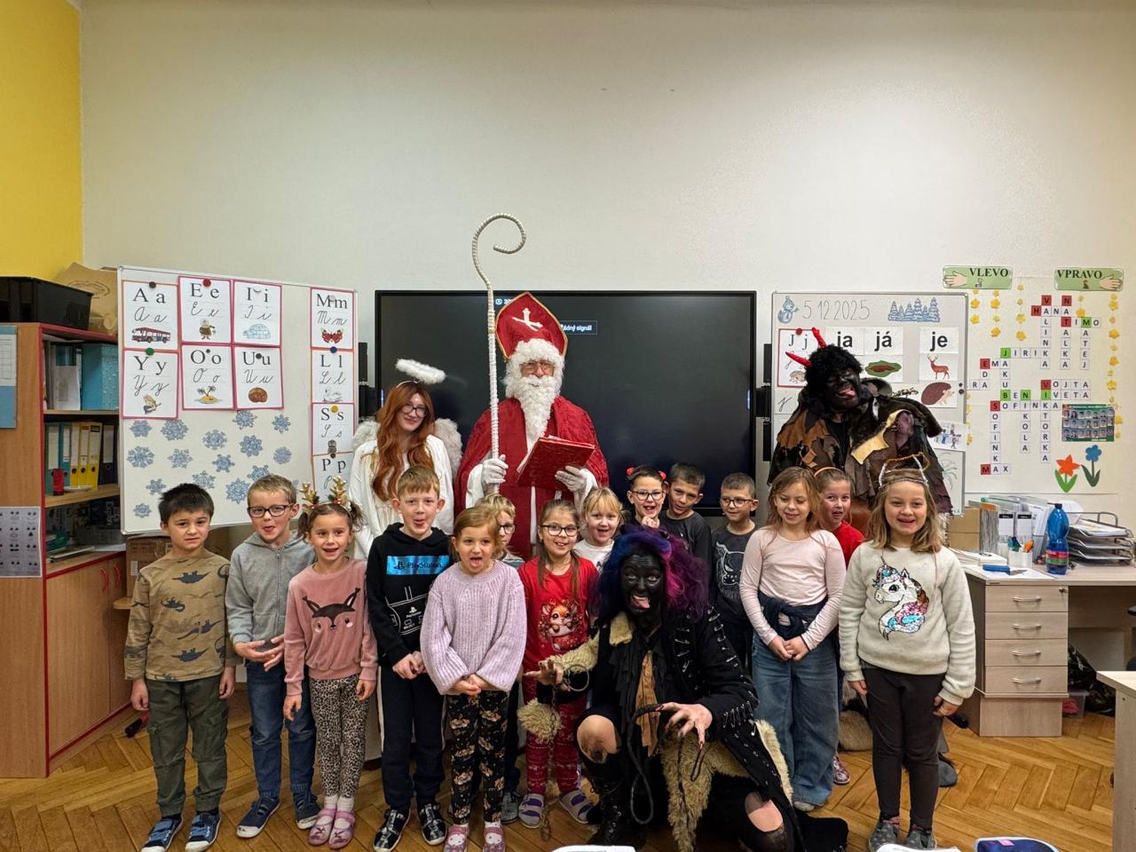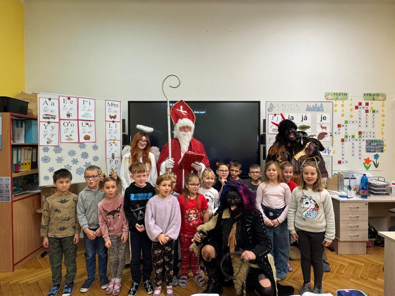 Dnes bylo ve škole opravdu veselo. Je 5. prosince a všechny děti moc dobře vědí, co tento den znamená. Už při příchodu do tříd byla na žácích patrná malá nervozita – možná zpytování svědomí? Ale kdepak, brzy to z nich spadlo. 😉