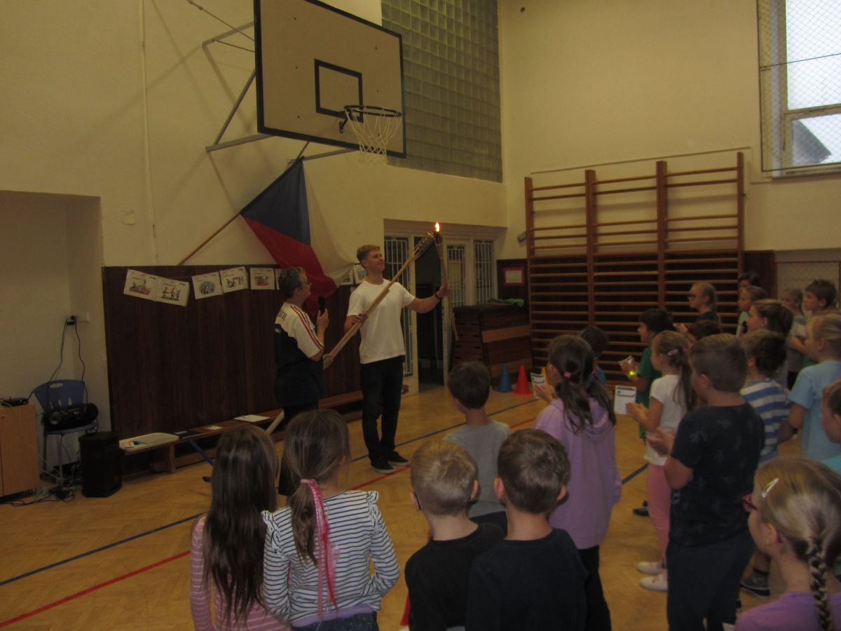 Po halloweenském veselení jsme si odpočali od učení a zpestřili si den sportem v rámci akce Olympijský víceboj. Žáky přijel pozdravit a povzbudit v jejich výkonech bývalý žák naší školy a současný juniorský mistr světa v kanoistice Honza Bárta. Ten si s žáky popovídal o tom, co všechno vrcholový sport obnáší a kolik dřiny stojí za každým úspěchem. Po besedě předal nadějný kanoista třem nejlepším sportovcům z každé třídy diplomy a rozdal žákům ceny „fair play“. Děti Honzovi na oplátku předaly své vzkazy, obrázky a hlavně spoustu přání, aby se mu i nadále ve sportu dařilo.