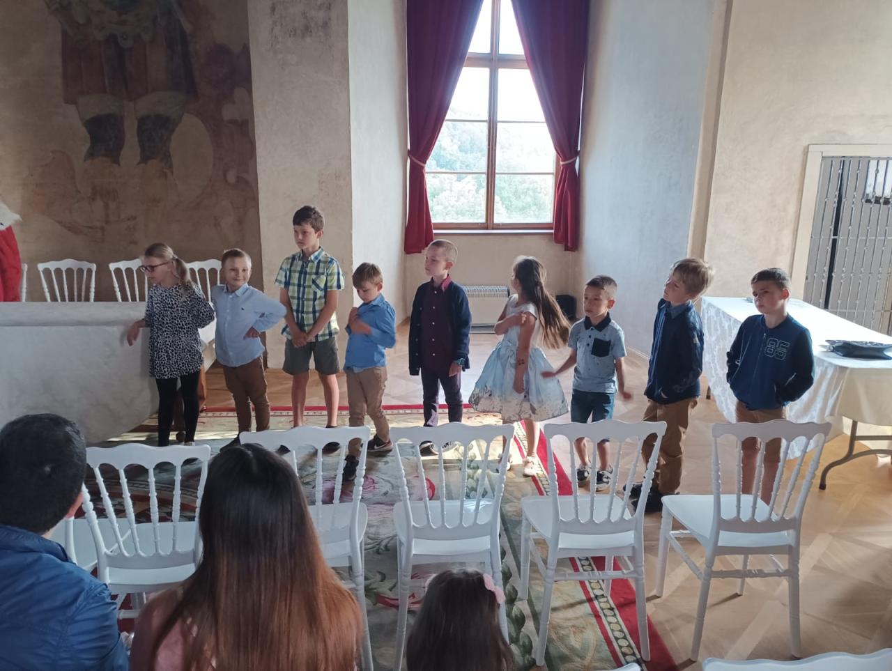 Prvňáčci zahájili nový týden slavnostní událostí, a to Pasováním na čtenáře. Podpořit je přišli rodiče, prarodiče i sourozenci. V Rytířském sále zámku Nelahozeves složili úspěšně čtenářskou zkoušku. Poté byli pasováni na rytíře a rytířky Čtenářského řádu samotnou královnou: „Ve jménu pohádek, příběhů a básní, jménem všech literárních hrdinů a světů, za všechny spisovatele a učitele Vás nyní pasuji na rytíře Řádu čtenářského. Mějte v úctě slovo a ochraňujte knížky. Statečně a čestně bojujte za všechno dobré, co je v nich napsáno. Nechť je vám knížka přítelem a moudrým rádcem.“ Žáci prvního ročníku dali královně slib: „Slibuji, že se budu vždy chovat jako rytíř Řádu čtenářského. Budu knížky opatrovat a chovat se k nim s úctou. Tak slibuji!“